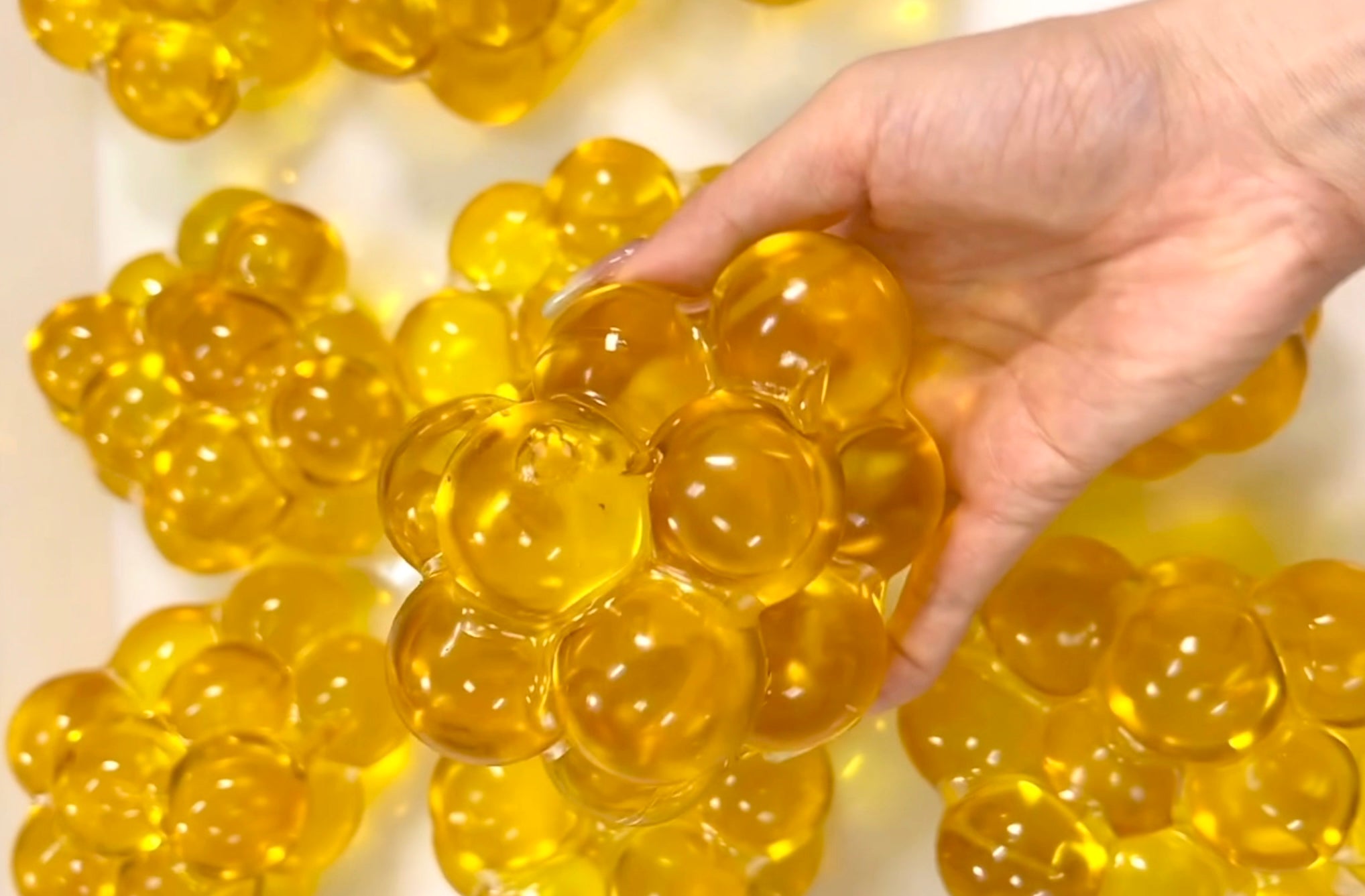 Great stress ball! The white skin on this toy makes the beads really pop when you stretch it. It has a nice smell - kind of like coconut. Best to stretch after removing the air with a syringe.